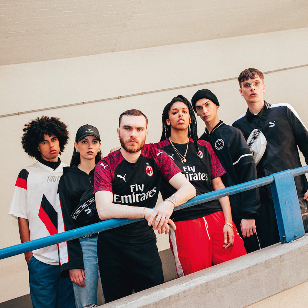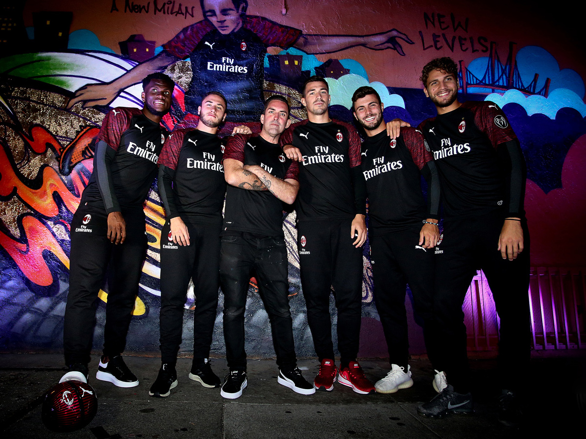 En la 87 Capp Street donde los artistas de San Francisco, California, la marca deportiva PUMA y el AC Milan Club de renombre mundial anunciaron conjuntamente la nueva segunda camiseta del equipo en la temporada 2018-19, el jugador del Milan Franck Kessié, Manuel Manuel Locatelli, Patrick Cutrone, Alessio Romagnoli y Davide Calabria en el artista local Sam · La nueva camiseta se muestra frente al enorme muro de graffiti temático creado por Sam Flores.Camisetas de Futbol Europa Replicas.
